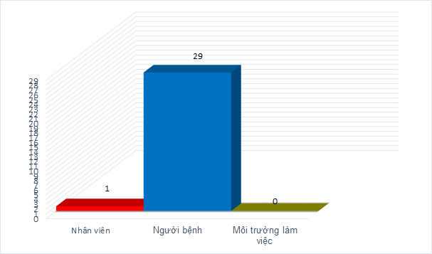 Từ bảng 1.3 ta thấy, 97% sự cố y khoa xảy ra trên người bệnh. Chỉ có 1 sự cố xảy ra đối với nhân viên y tế, tỷ lệ 3%.