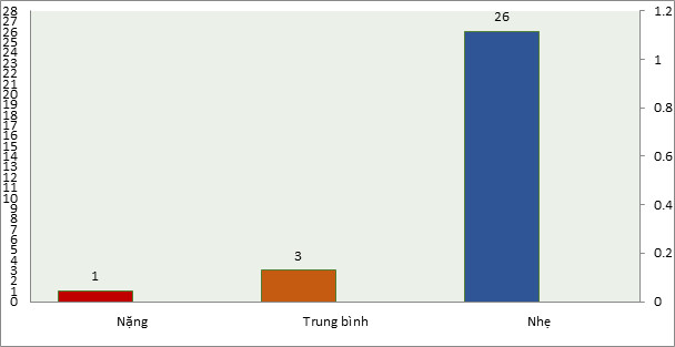 Qua biểu đồ trên ta thấy, có 30 sự cố y khoa trong đó sự cố ở mức độ nhẹ chiếm 86.7%, sự cố ở mức độ trung bình chiếm 10% và sự cố ở mức độ nặng chiếm 3.3%.
