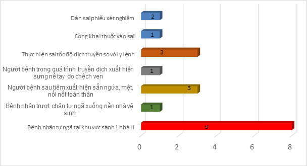 Qua biểu đồ tổng hợp các sự cố y khoa hay gặp tại đơn vị ta thấy, đa số sự cố xảy ra trên người bệnh do sơ ý va đập, trơn trượt bị ngã trong quá trình đi khám và nằm điều trị, có 9 sự cố chiếm tỷ lệ 30% . Sự cố người bệnh sau tiêm xuất hiện sẩn ngứa, mệt, nổi nốt toàn thân, có 3 sự cố, chiếm tỷ lệ 10%. Điều dưỡng thực hiện y lệnh của bác sỹ trong quá trình truyền dịch chưa đúng chiếm tỷ lệ 10%.