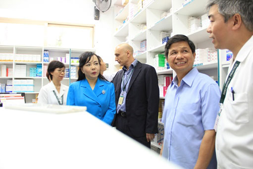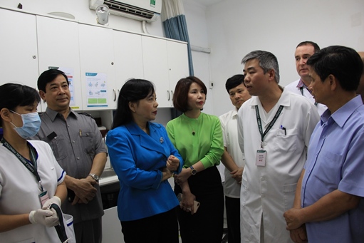 Bộ trưởng Nguyễn Thị Kim Tiến cùng đoàn công tác trao đổi với một bác sĩ người Trung Quốc tại phòng khám đa khoa Thiên Tâm
