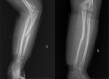 Trước đó 15 ngày, sau khi bị ngã gãy xương cẳng tay trái, người bệnh được gia đình đưa đi bó thuốc nam. Tuy nhiên tình trạng đau và hạn chế vận động cẳng-bàn tay trái ngày một tăng dần.