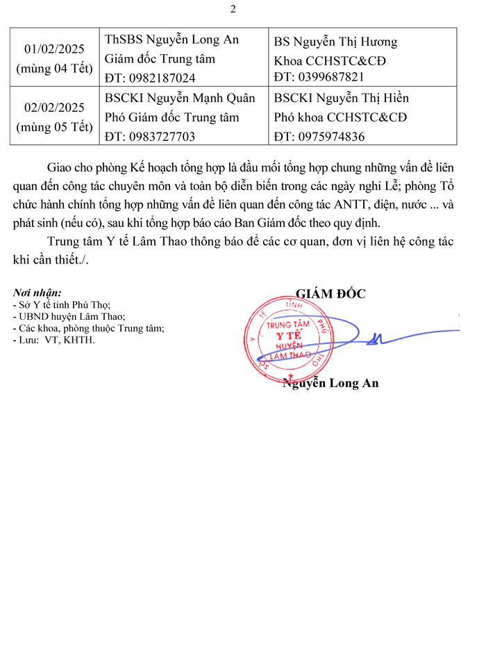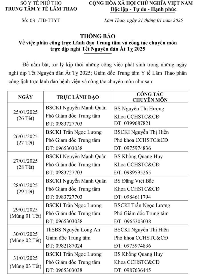 Thông báo phân công trực Tết Nguyên đán Ất Tỵ năm 2025