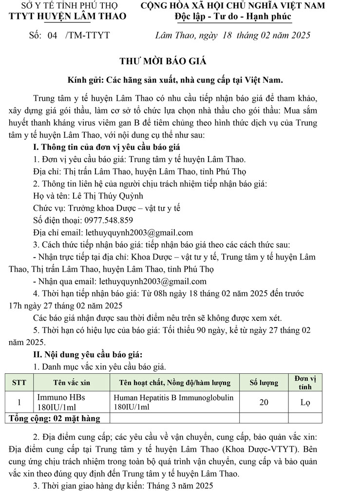 Thư mời báo giá gói thầu mua huyết thanh viên gan B