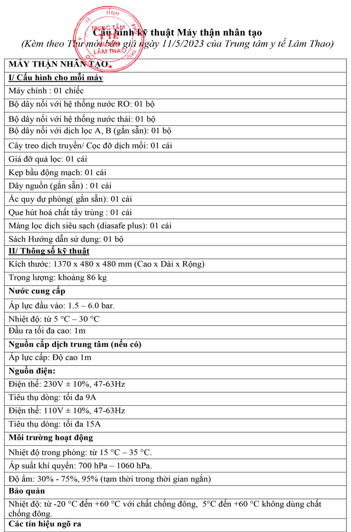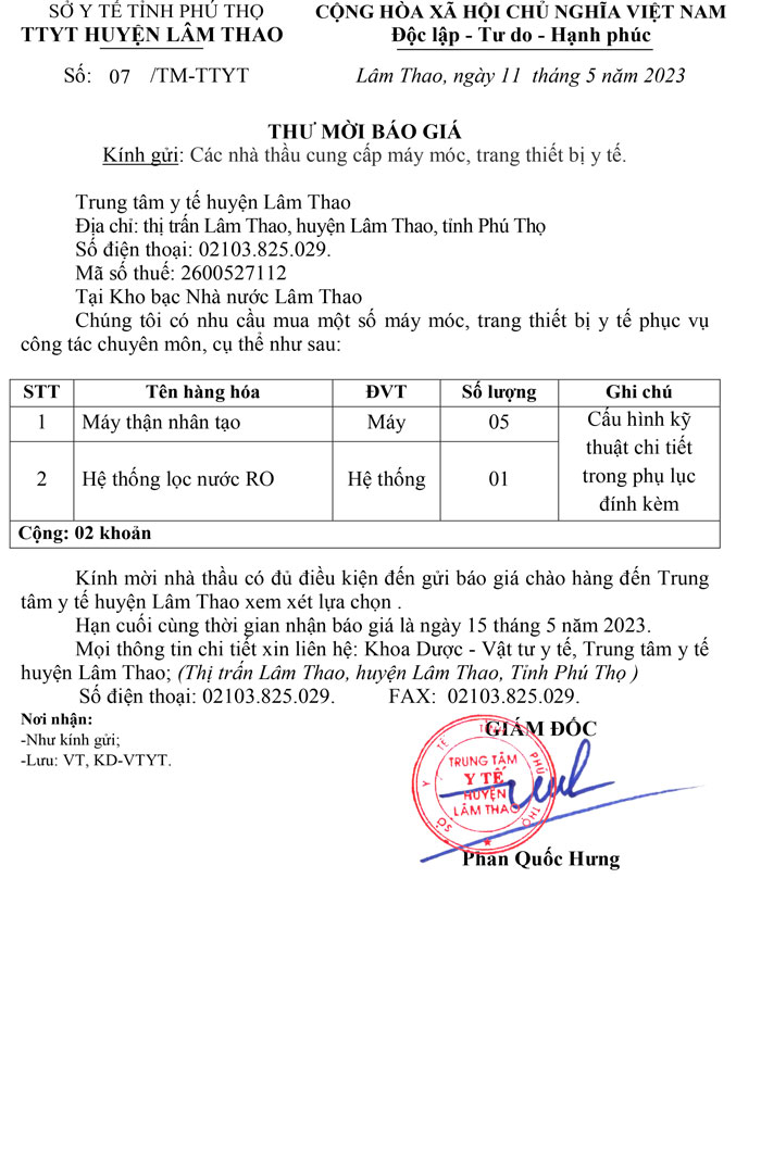 Thư mời báo giá số 07/TM-TTYT ngày 11/5/2023 của Trung tâm Y tế Huyện Lâm Thao