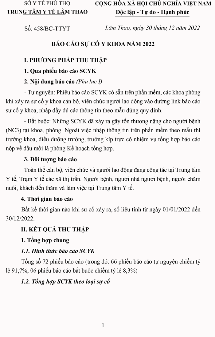 Báo cáo số 458/BC-TTYT ngày 30/12/2022 của Trung tâm Y tế huyện Lâm Thao
