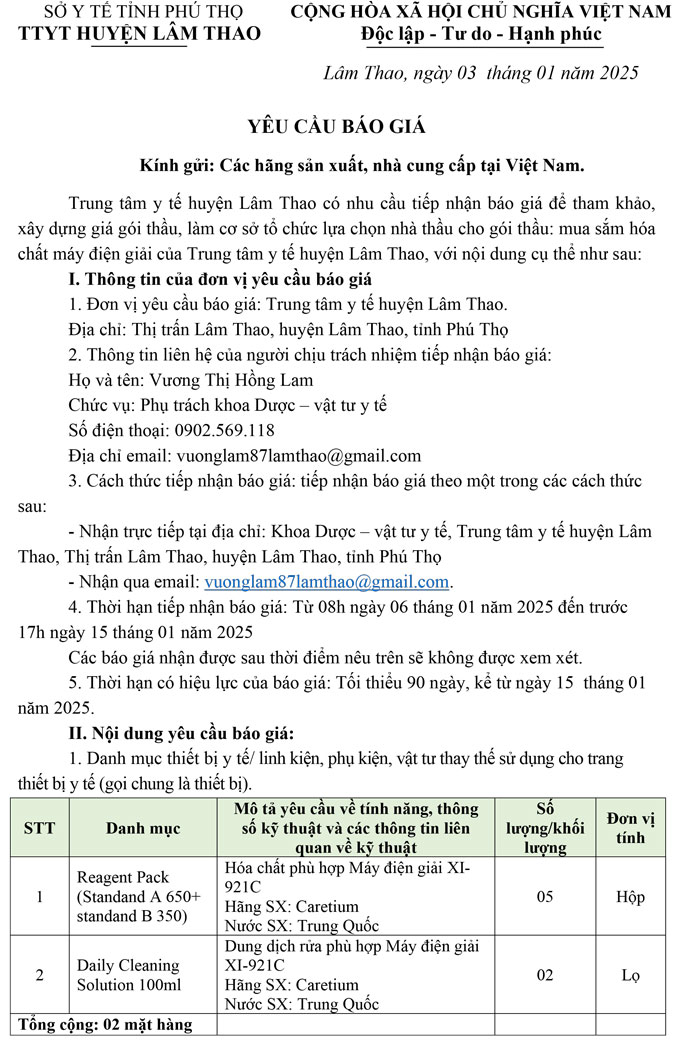 Yêu cầu báo giá mua sắm vật tư y tế phục vụ chuyên môn của Trung tâm y tế khu vực Lâm...