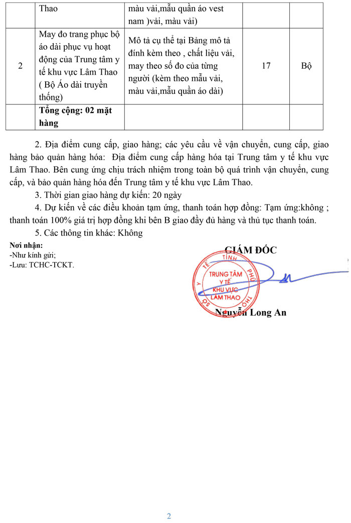 Yêu cầu báo giá may đo bộ áo dài phục vụ hoạt động của Trung tâm y tế khu vực Lâm Thao