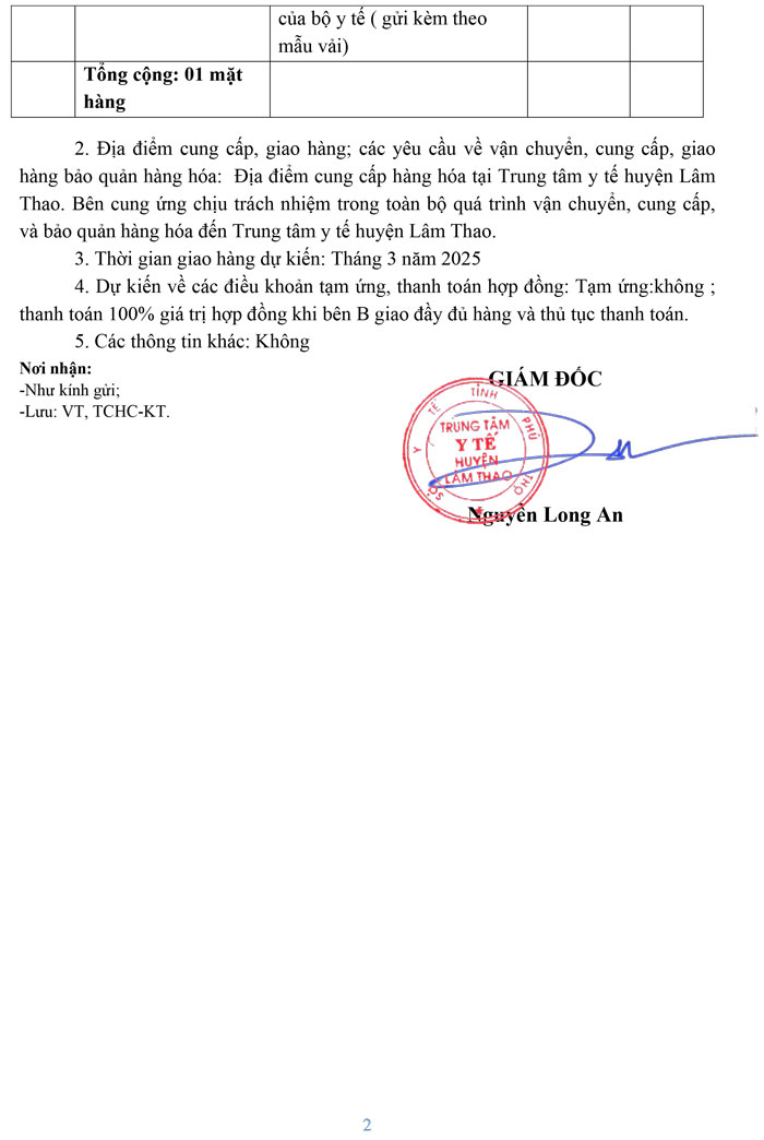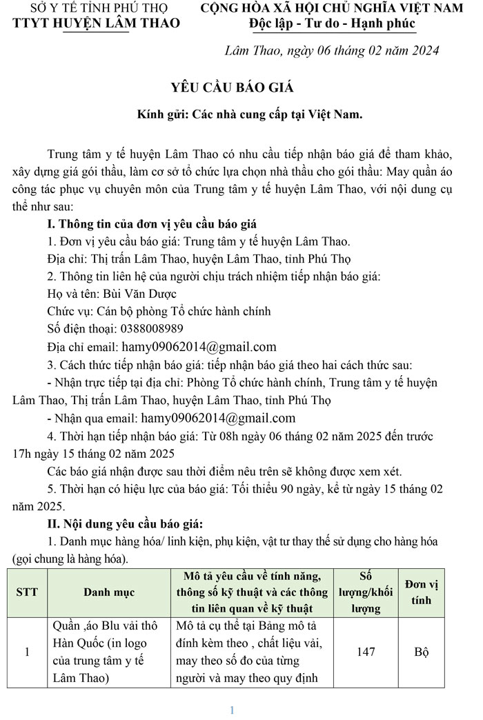 Yêu cầu báo giá may đo bộ áo dài phục vụ hoạt động của Trung tâm y tế khu vực Lâm Thao