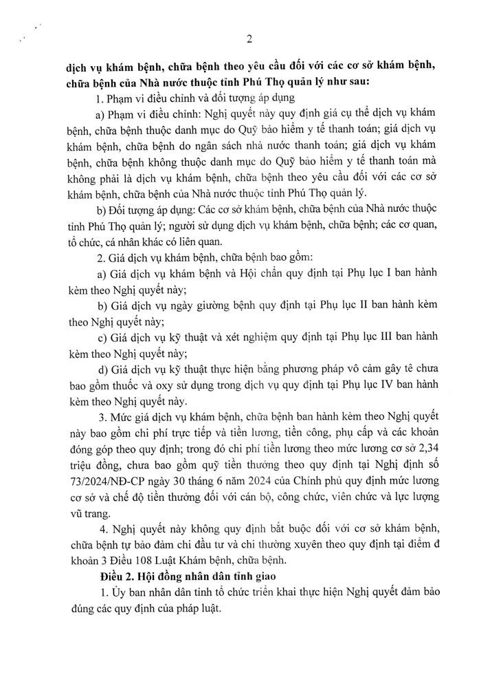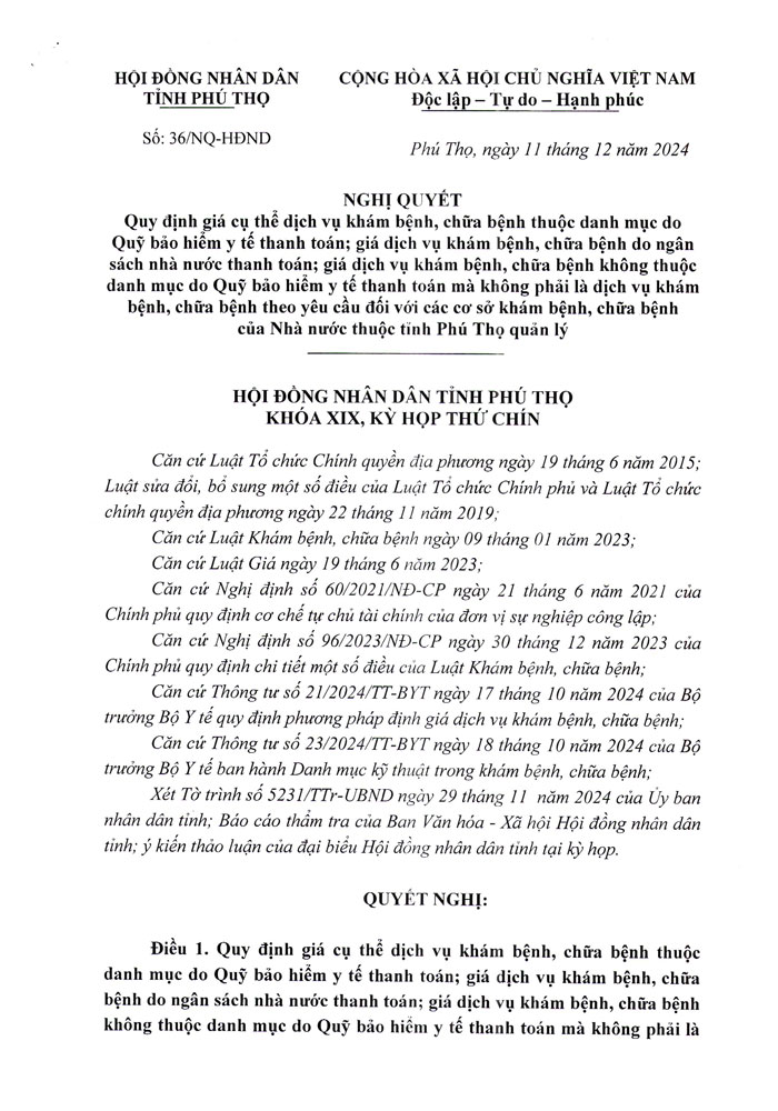 Hội đồng nhân dân tỉnh Phú Thọ ban hành Nghị quyết số 36/NQ-HĐND ngày 11/12/2024 về Quy định giá cụ thể dịch vụ khám bệnh, chữa bệnh...