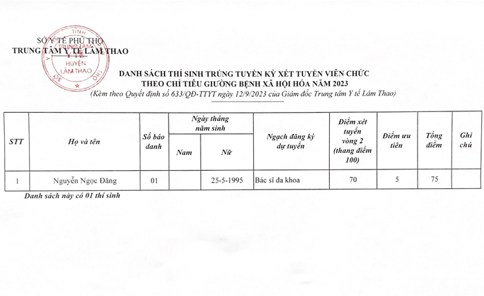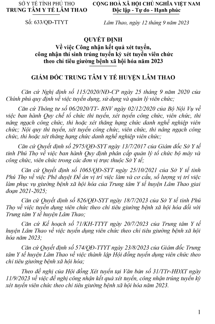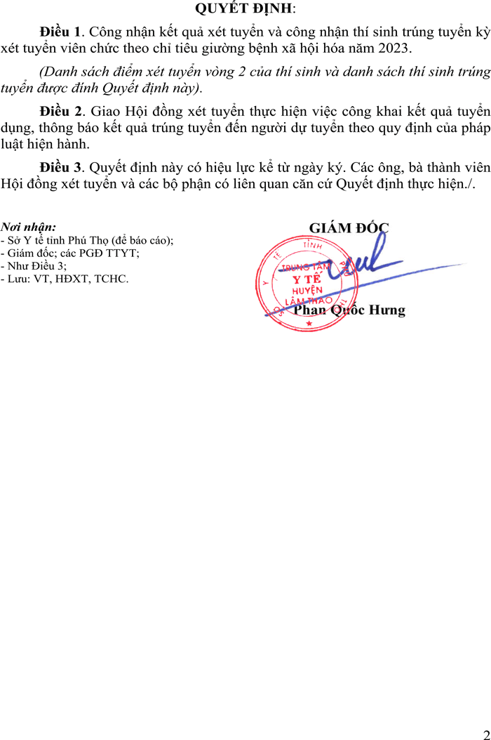 Quyết định về việc công nhận kết quả xét tuyển, công nhận thí sinh trúng tuyển kỳ xét tuyển viên chức theo chỉ tiêu giường bệnh xã hội hóa năm 2023