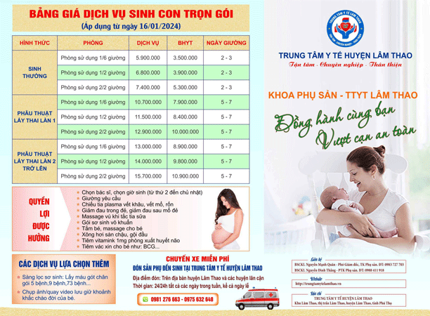 Hành trình mang thai là một hành trình thiêng liêng, đầy hạnh phúc nhưng cũng nhiều nỗi lo. Để giúp mẹ bầu có thể mạnh khỏe, an tâm đón bé yêu chào đời, Trung tâm Y tế Lâm Thao xin gửi đến bạn Bảng giá dịch vụ sinh con trọn gói của Trung tâm, cùng bạn trở thành người bạn đồng hành trong chặng đường “vượt cạn” đầy yêu thương.