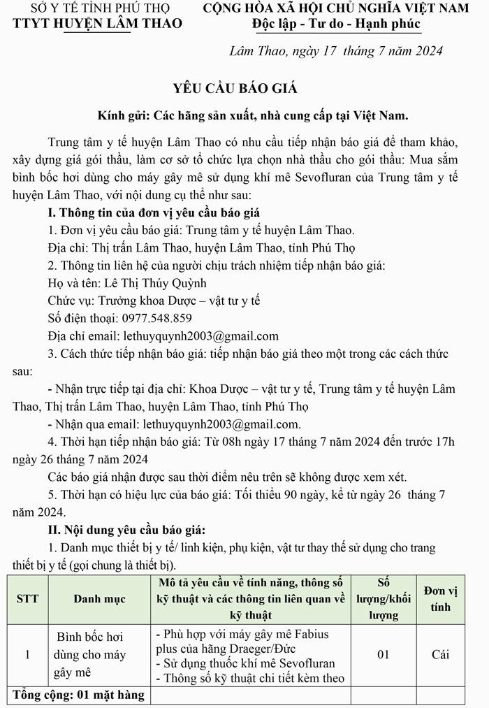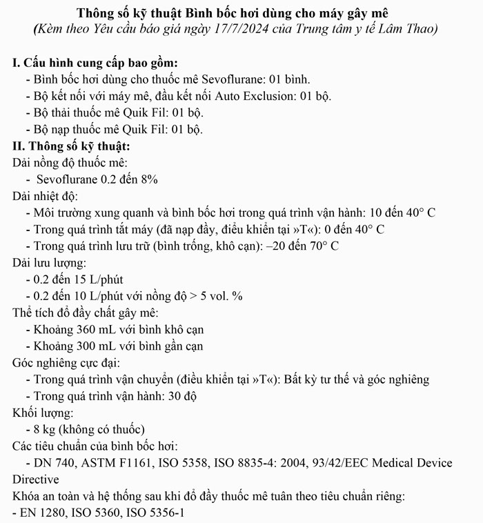 Yêu cầu báo giá Bình bốc hơi dùng cho máy gây mê
