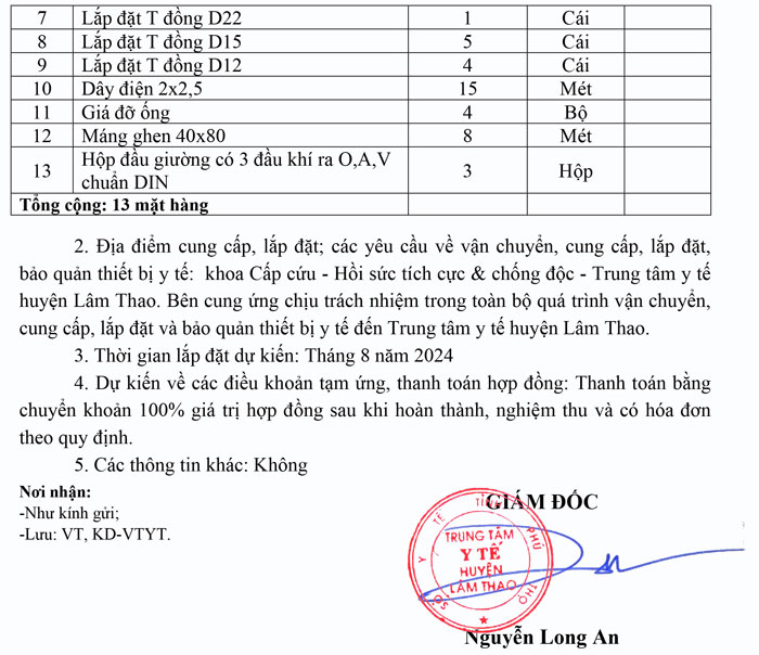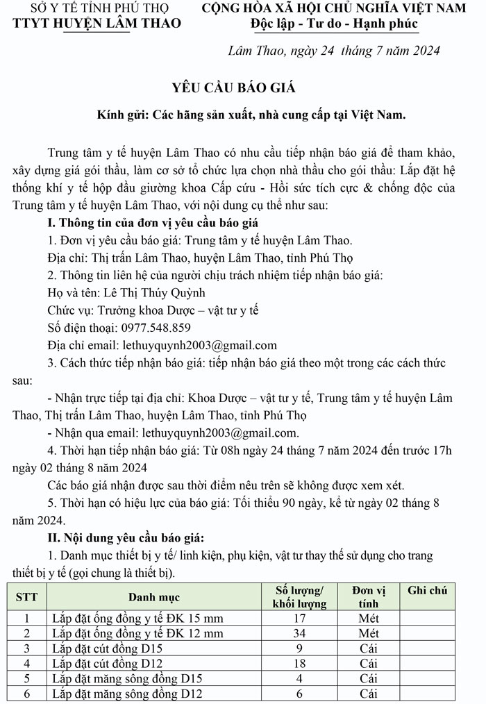 Yêu cầu báo giá lắp đặt hệ thống khí y tế