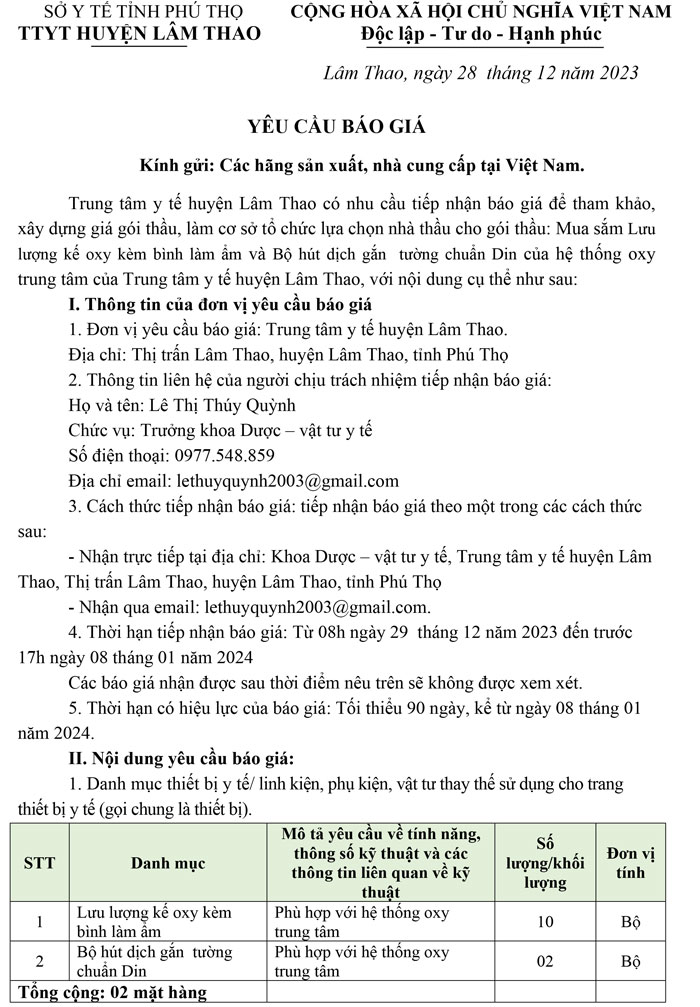 Yêu cầu báo giá lưu lượng kế oxy và bộ hút dịch